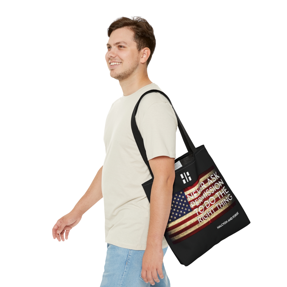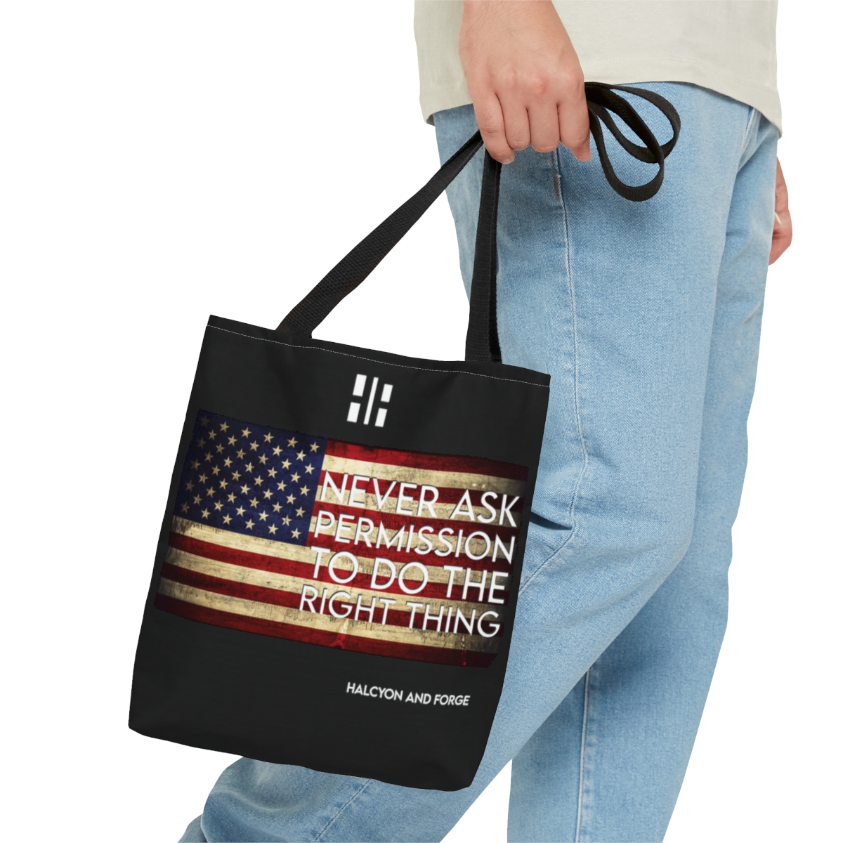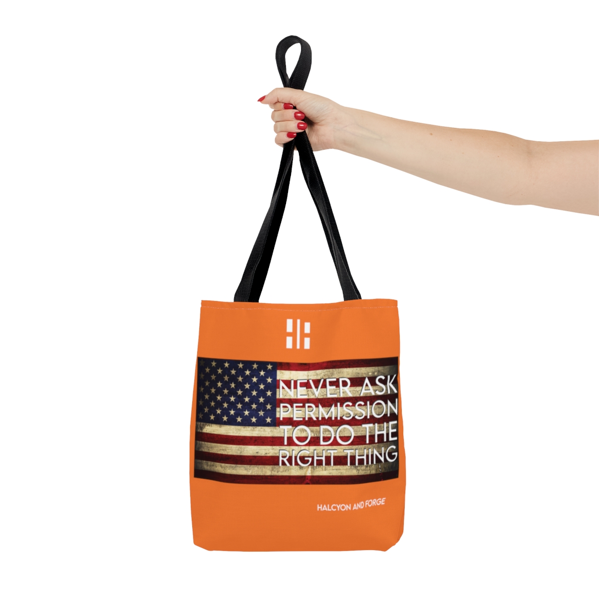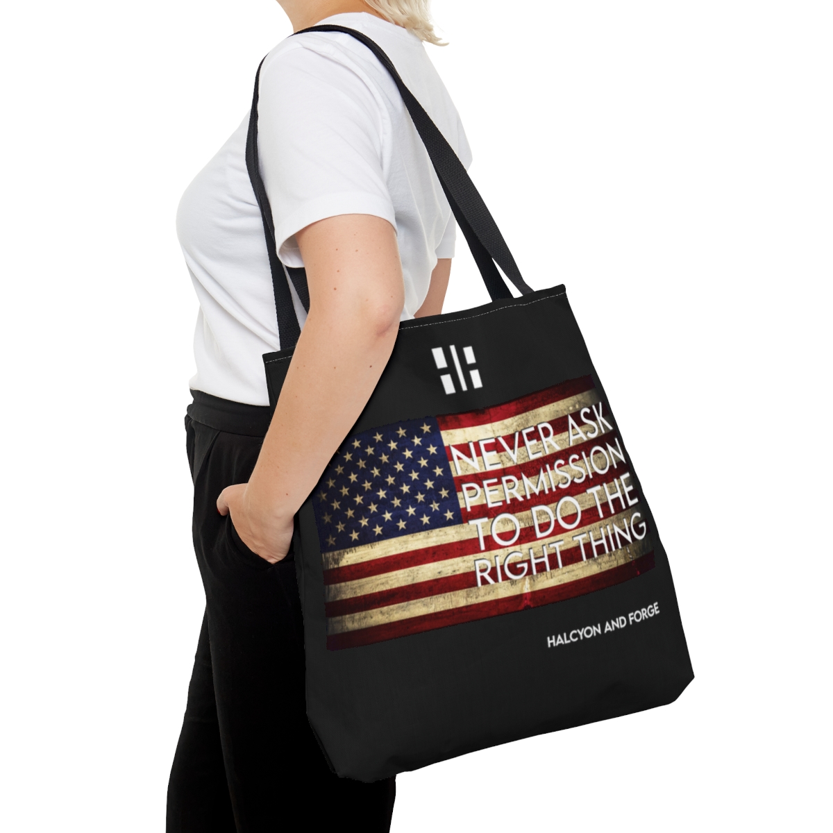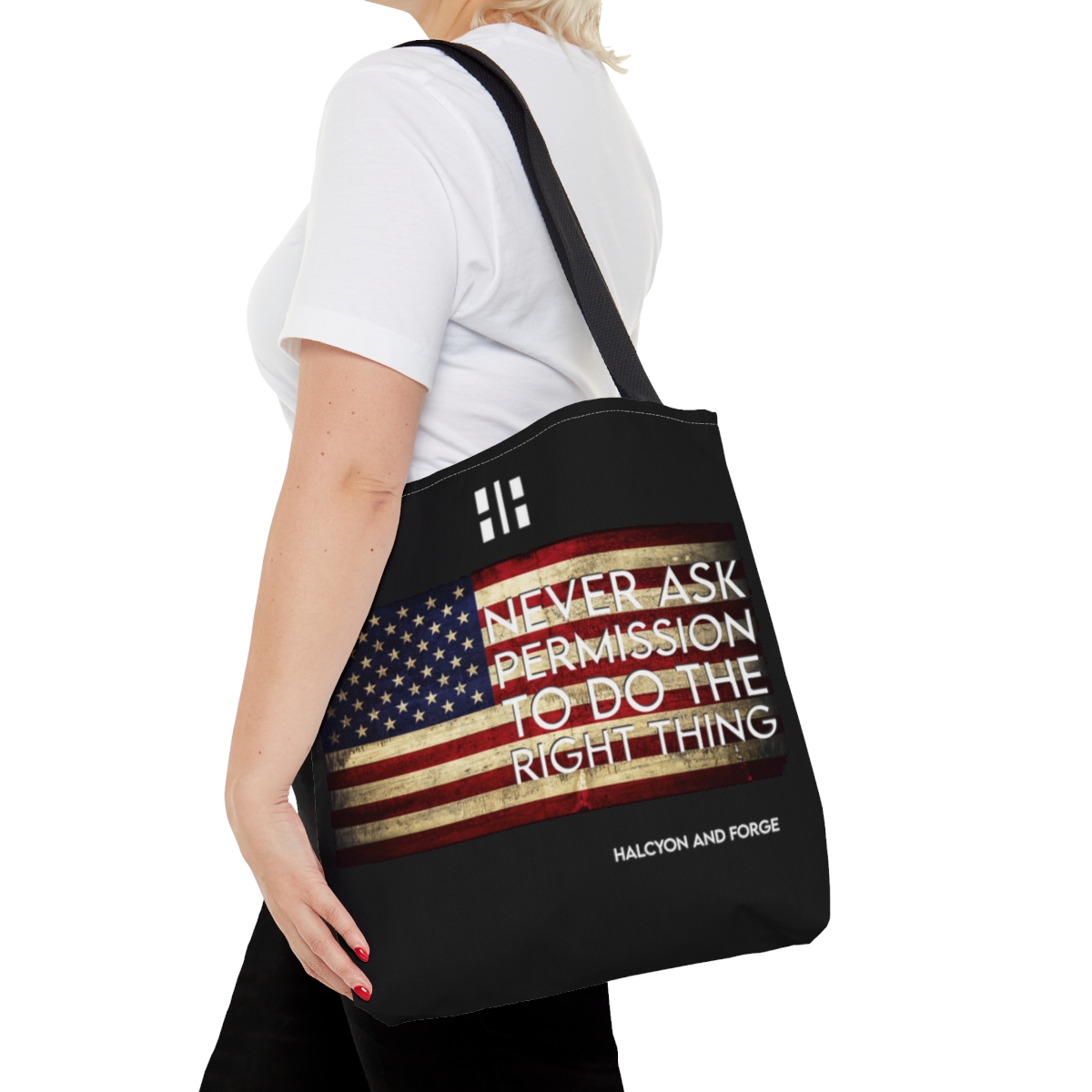 Introducing our ‘Never Ask Permission to Do the Right Thing’ tote, a perfect fusion of statement and style. Available in a versatile range of seven striking colors and tailored to fit your needs in small, medium, or large. It’s not just a tote—it’s a daily affirmation of your values, making a bold statement with every carry. Whether it’s for a day out or a quick grocery run, this tote complements every occasion. Let your bag do the talking and echo your convictions. Choose your size, pick your color, and carry your belief with pride. Click ‘Buy’ and wear your mantra on your shoulder